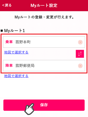 - ③乗車地、到着地を入力して「保存」ボタンを押すと、Myルートとして保存されます。
